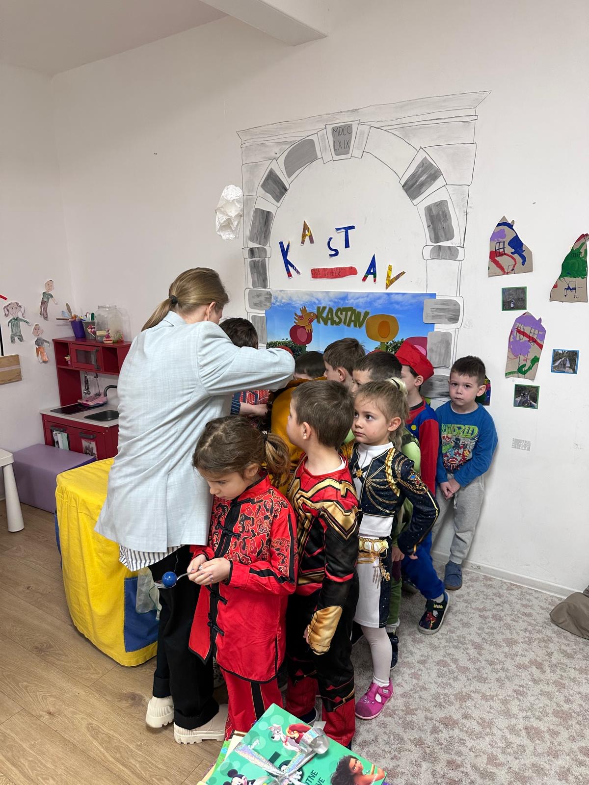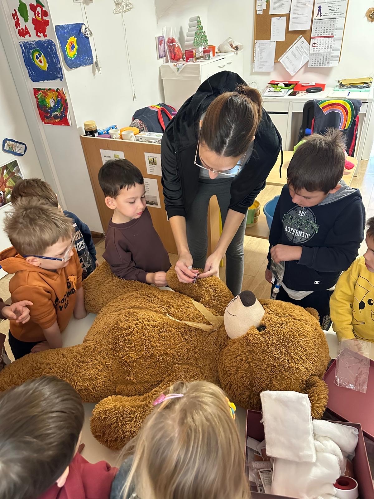 Marijina mama Klara-veterinarka, pokazala nam je što veterinar radi i kako pomaže životinjama, a donijela je i radni pribor: stetoskop, toplomjer, zavoje, šprice bez igala.