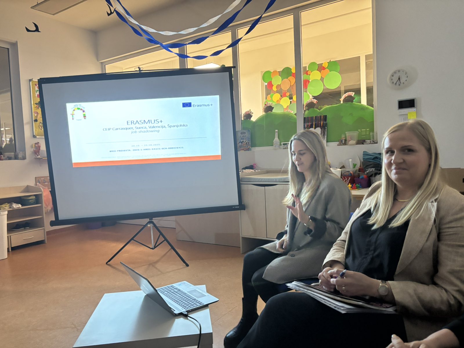 U sklopu Erasmus+ projekta 2025-1-HR01-KA121-SCH-000326421, ravnateljica Helena Ninković Budimlija, odgojiteljice Sara Marmilić, Renata Josipović Tankosić, Korana Lisjak te pedagoginja Martina Rončević boravile su od 20. do 25. listopada 2025. u vrtiću CEIP Carrasquer u Sueci, mjestu nedaleko Valencije u Španjolskoj. Mobilnost je bila usmjerena na praćenje rada i pedagoške prakse s naglaskom na razvoj kompetencija u području informacijsko-komunikacijske tehnologije te razumijevanje održivih i funkcionalnih pristupa odgojno-obrazovnom radu.